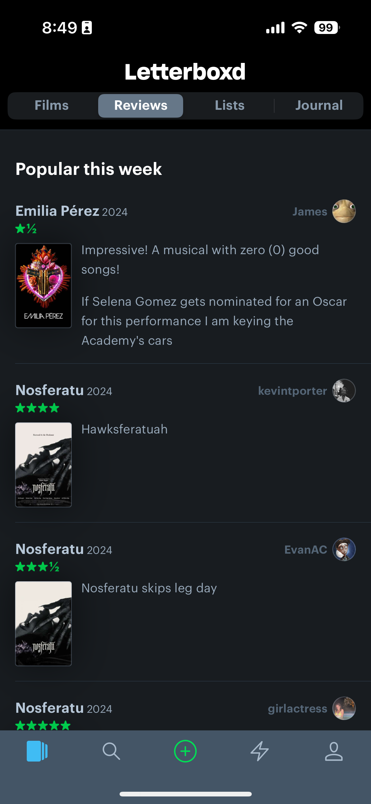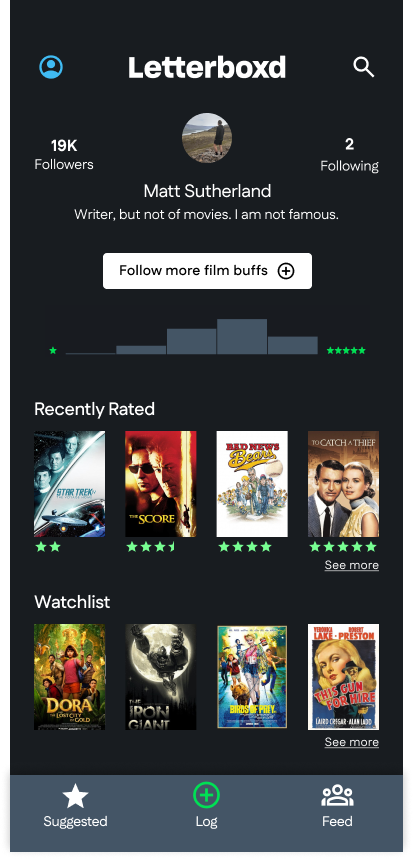 Engaging with other Letterboxd users, particularly ones you know personally, is a challenge. I can find popular reviews from that week, but finding specific people who aren’t the top 10 most active users is near impossible. Where are the other cinephiles? I would imagine I could do that from the Profile page, but no dice. I could search for them, but that assumes I know their alias and/or username.