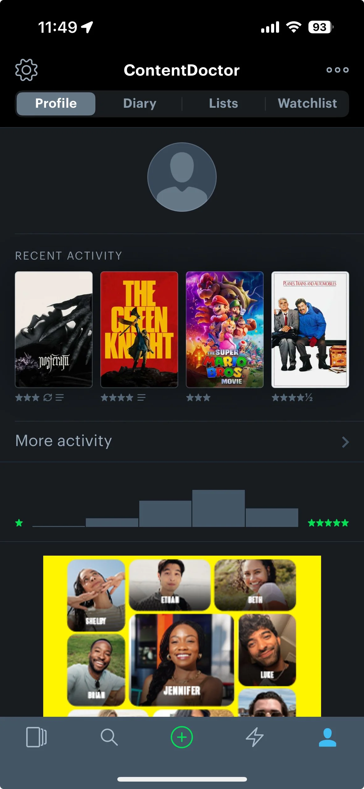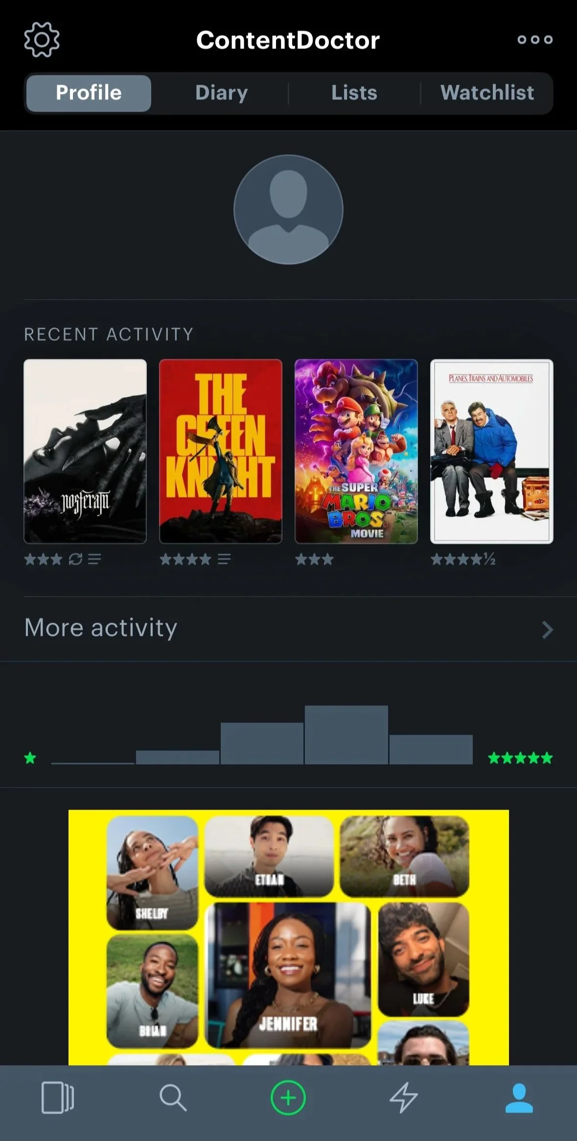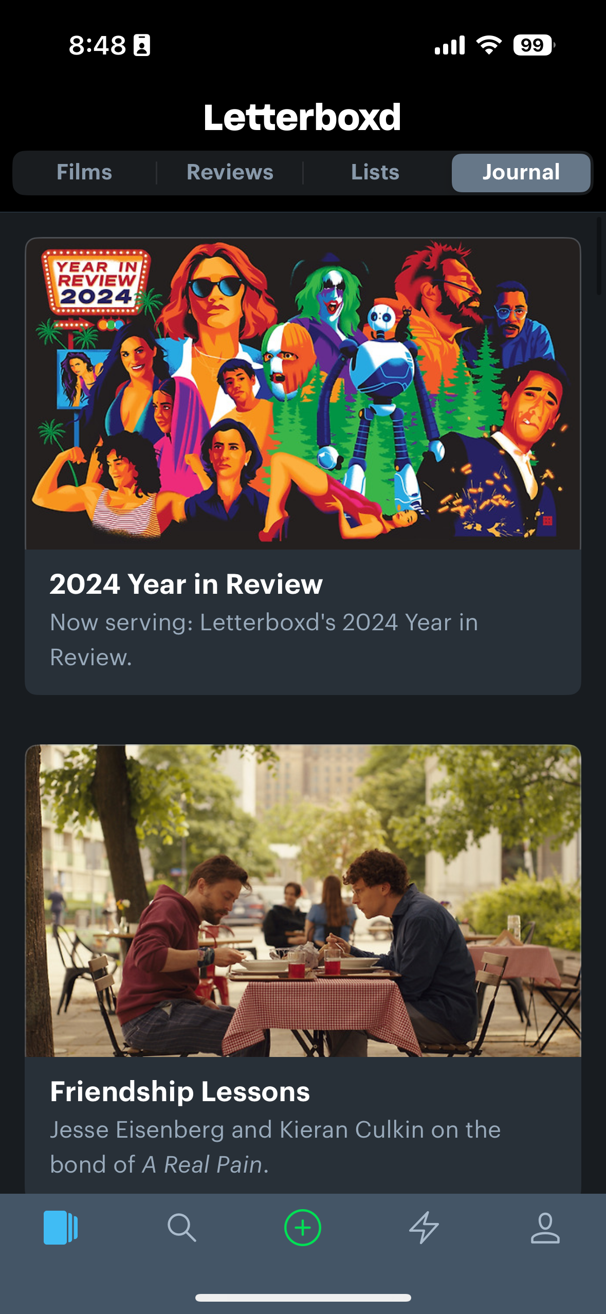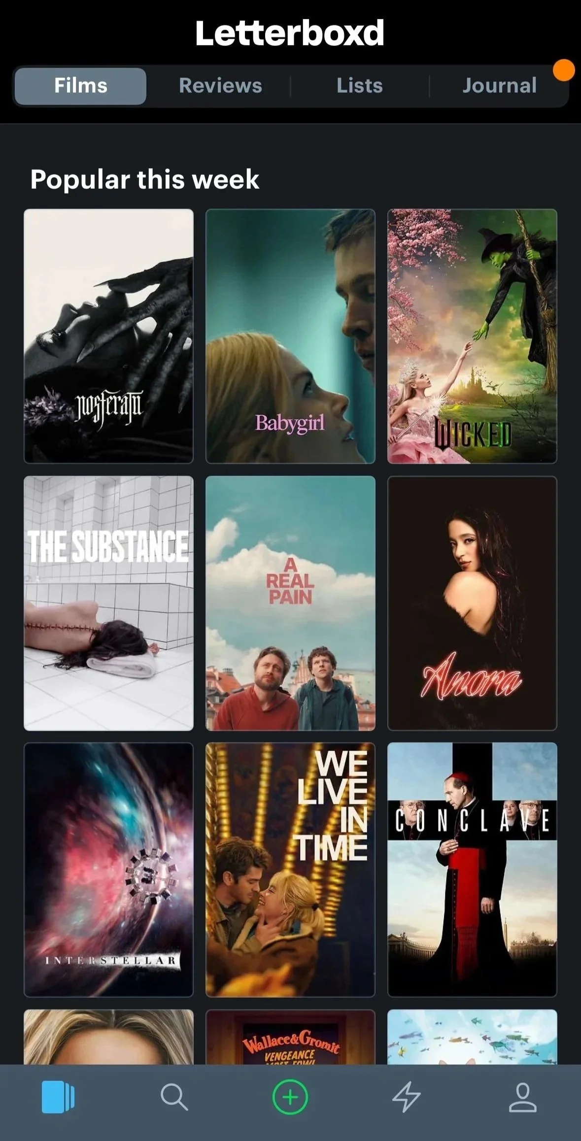 Content consumption is simply too disparate on Letterboxd. “Journal” is too vague — my journal? Or Letterboxd’s? These are all secondary navigation items from the main screen, which looks like a catchall for all things Letterboxd couldn’t figure out how to categorize.