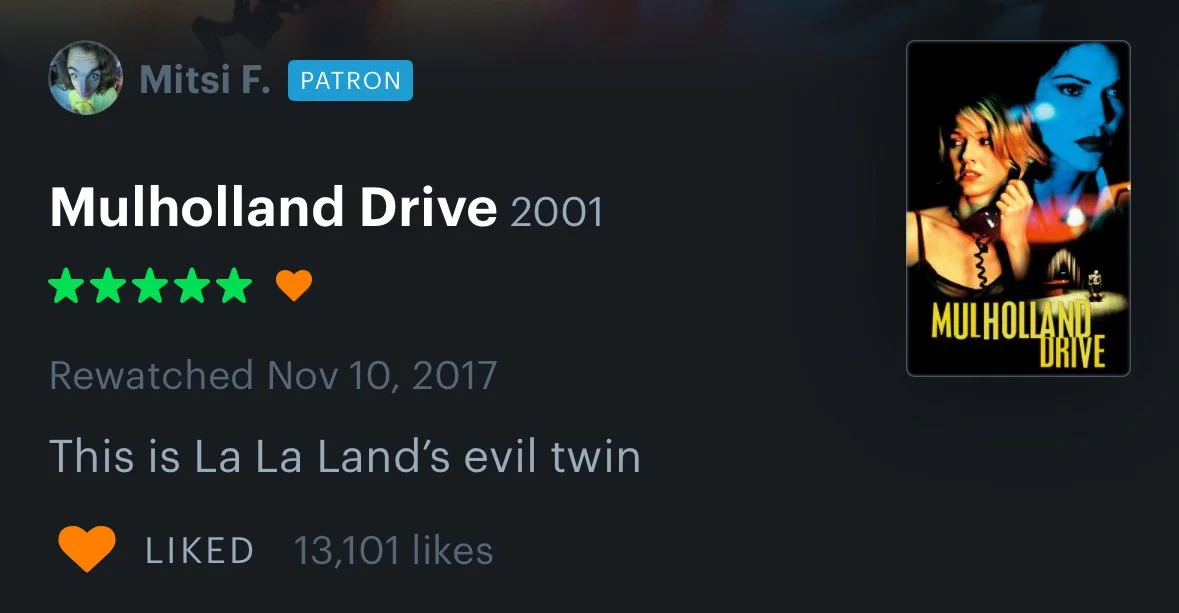 Letterboxd styles itself as a niche social media platform for cinephiles. It gets about half of that right. Which is a shame, because they put out great interviews with writers and directors. Even some of the randos’ reviews are quite good or even funny, like this one for Mulholland Drive (RIP David Lynch):