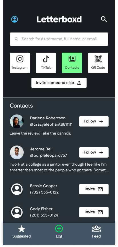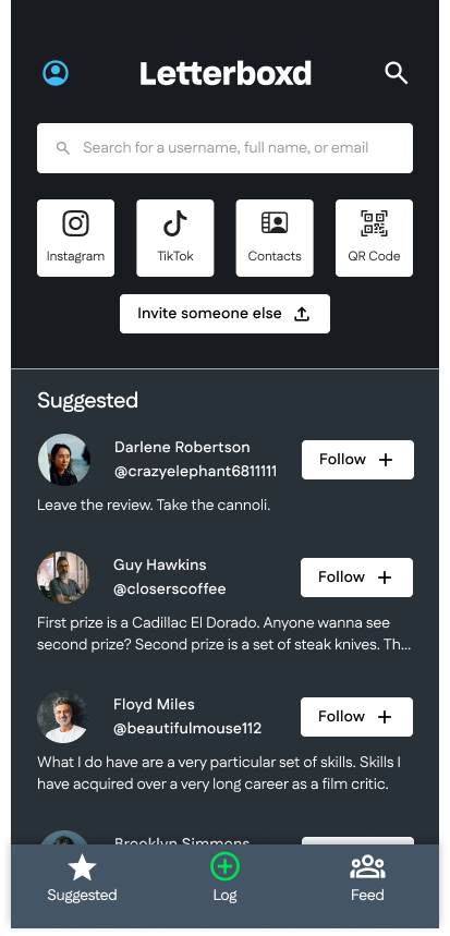 Following the Robustness Principle, we increase the number of methods that we use to accept inputs, while simplifying the number of outcomes. Users may choose from a number of different connection methods, including social media integrations, to find and invite people they already know to join them on Letterboxd.